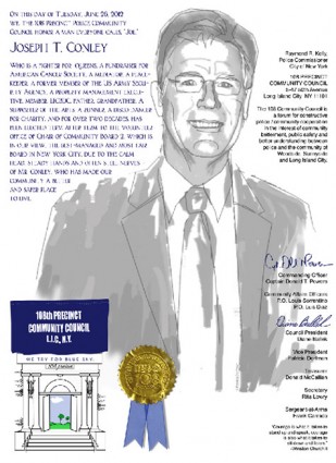 Meanwhile, the 108 Police Precinct Community Council presented its annual Community Person of the Year award to Joseph Conley, chairman of Community Board 2, for his volunteer work.