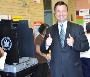 Incumbent Assemblymember Mike Miller cast his vote at noon at P.S. 91 in Glendale, down the block from his elementary school, St. Pancras, and is feeling confident.
