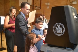 Accompanied by wife Wendy and the pair’s three children, Ryan, 10, and 5-year-old twins Alexander and Jackie, the businessman and local attorney filed his vote inside the gymnasium at P.S. 46. Messer is looking to sweep State Senator Toby Ann Stavisky’s spot in the 16th District — a position she has held for the past 13 terms.
