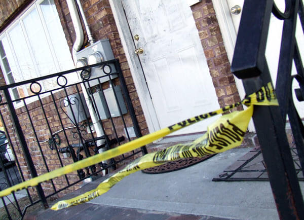 The home was cordoned off by emergency tape Sunday, with dark smudges marking the white front door.