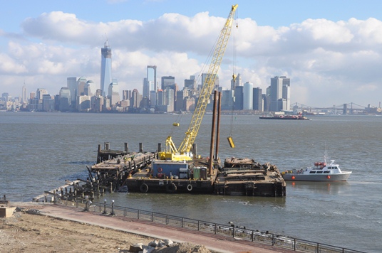 Work to remove the damaged Liberty Island Shuttle Dock. (Photo by Kevin Daley, NPS Photographer)