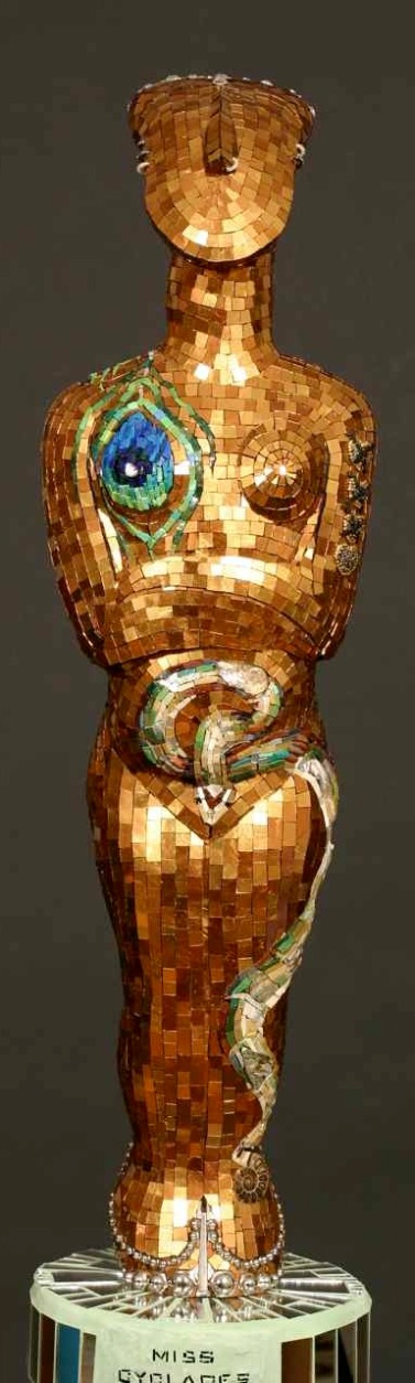 One of her pageant beauties, “Miss Cucuteni 2011” depicts on one half of the figure the colorful beauty of Mother Nature, yet on the other half, the colorful stones are replaced by coal and barbed wire showing the destruction of suppression and exploitation.