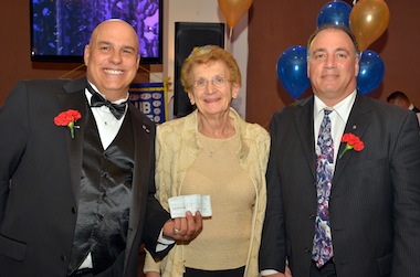 Steven Sirgiovanni accepts a check from Marjorie Centrone, with president Edward Tudisco