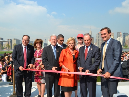 Mayor Michael Bloomberg gathered with local elected officials, community members and residents on Wednesday to cut the ribbon on the new 5.5-acre Hunter’s Point South Park located on Center Boulevard in Long Island City.