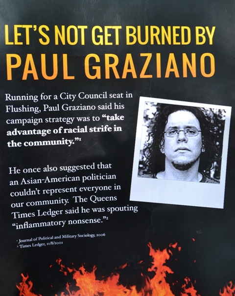 Graziano, in the latest mailer, is seen engulfed in flames under a headline that reads “Let’s not get burned by Paul Graziano.”