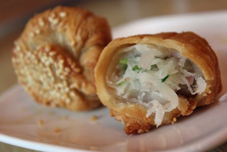Following their lead, I tried the turnip puffs, like a savory Chinese miniature counterpart to the Italian sfogliatelle. Where the Italians use custard, these Chinese pastries are filled with shredded daikon, minced vegetables, and tiny cubes of pork—then crusted in sesame seeds and baked to golden brown.