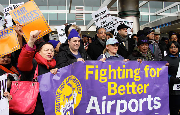 More than 100 workers carried signs and chanted slogans Tuesday afternoon outside the departures level of the airport’s central concourse. The union has been working for some time now to organize security guards, cleaners, baggage handlers and other service employees at the region’s three airports in their fight for better wages and benefits.
