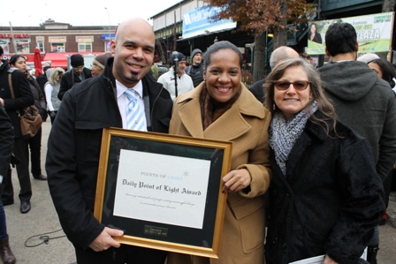 Ferreras also presented Edgar Gutierrez, store manager of the local Walgreens, with the “Daily Point of Light” award from the Points of Light Foundation for his volunteering and efforts to promote Corona Plaza.