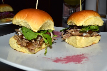 Then came the sliders, that definitely kicked our taste buds. The first set of sliders was Simply Pulled Pork, found already on the menu, that come with barbecue pulled pork, homemade pickles and cabbage served on potato bread buns. We then tried the brand new (and still in the works) smoked pulled duck sliders that featured a sweet dark cherry compote that balanced out the angry orchard apple cider cheese sauce.
