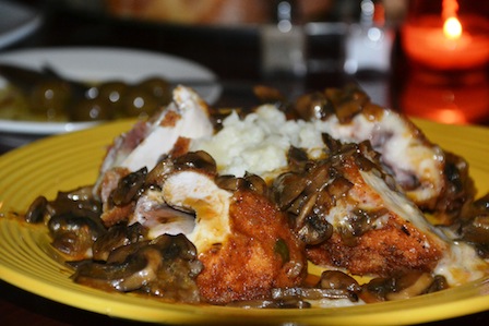The chicken cordon bleu, at $14.95, is a hefty meal with big pieces of tender chicken, served with mushrooms and mashed potatoes.