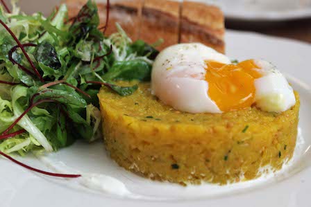 This dish is like a golden benedict plucked directly from the spring garden. A warm bed of ratatouille is flawlessly tender and tangy, topped with a triangle of goat cheese hash that could be eaten by the pieful. When that bright yellow yolk bursts over all of it, it gets pretty serious.