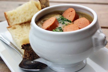 Thick, velvety potato soup is delivered in a miniature crock and can be brattopped with sliced medallions of knockwurst. The soup is quite memorable, but these bangers are meant to be far more than a soup crouton.