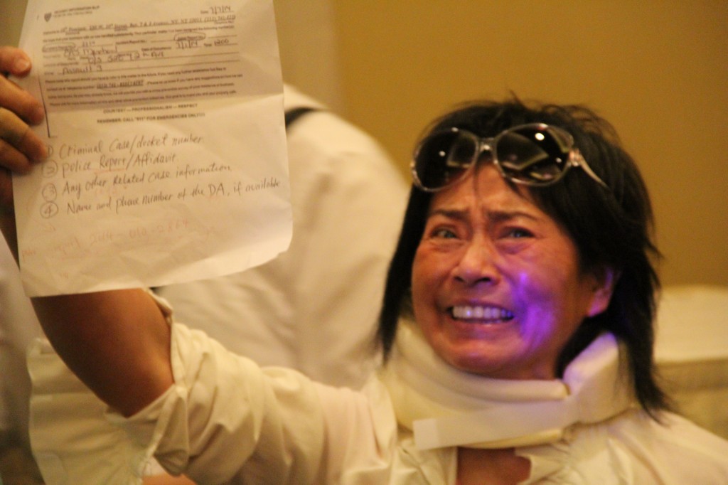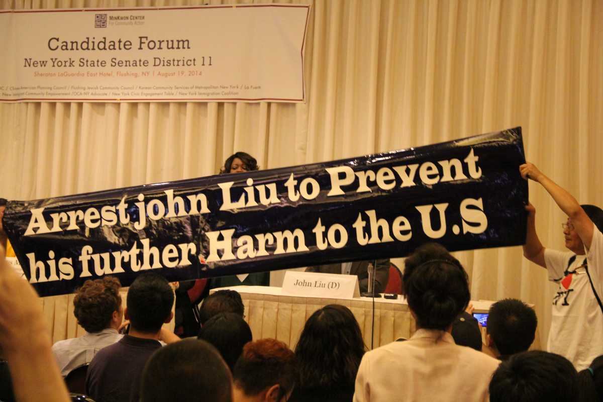 Unlike a debate, each person answered questions individually. But as soon as Liu took the stage several people from the large audience stood up from their seats, walked up to Liu and unraveled a sign that said “Arrest john [sic] Liu to Prevent his further Harm to the U.S.”