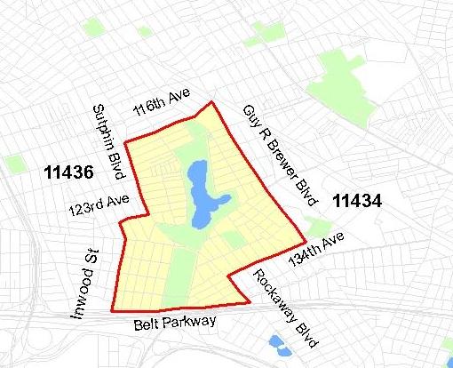 Parts of South Jamaica and Springfield Gardens (bordered by 116th Avenue to the north; Sutphin Boulevard, 123rd Avenue and Inwood Street to the west; Belt Parkway to the south; and Rockaway Boulevard, 134 Avenue and Guy R Brewer Boulevard to the east).