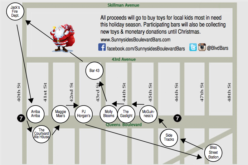 Sunnyside’s Boulevard Bars, a collective of 11 bars and restaurants on and around Queens Boulevard, will be holding their Third Annual Sunnyside Santathon pub crawl for charity on Saturday starting at 3 p.m. The event will be sponsored by S.K.I Beer.