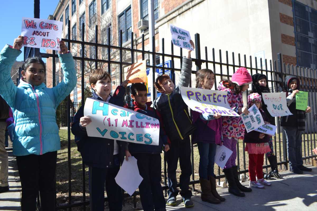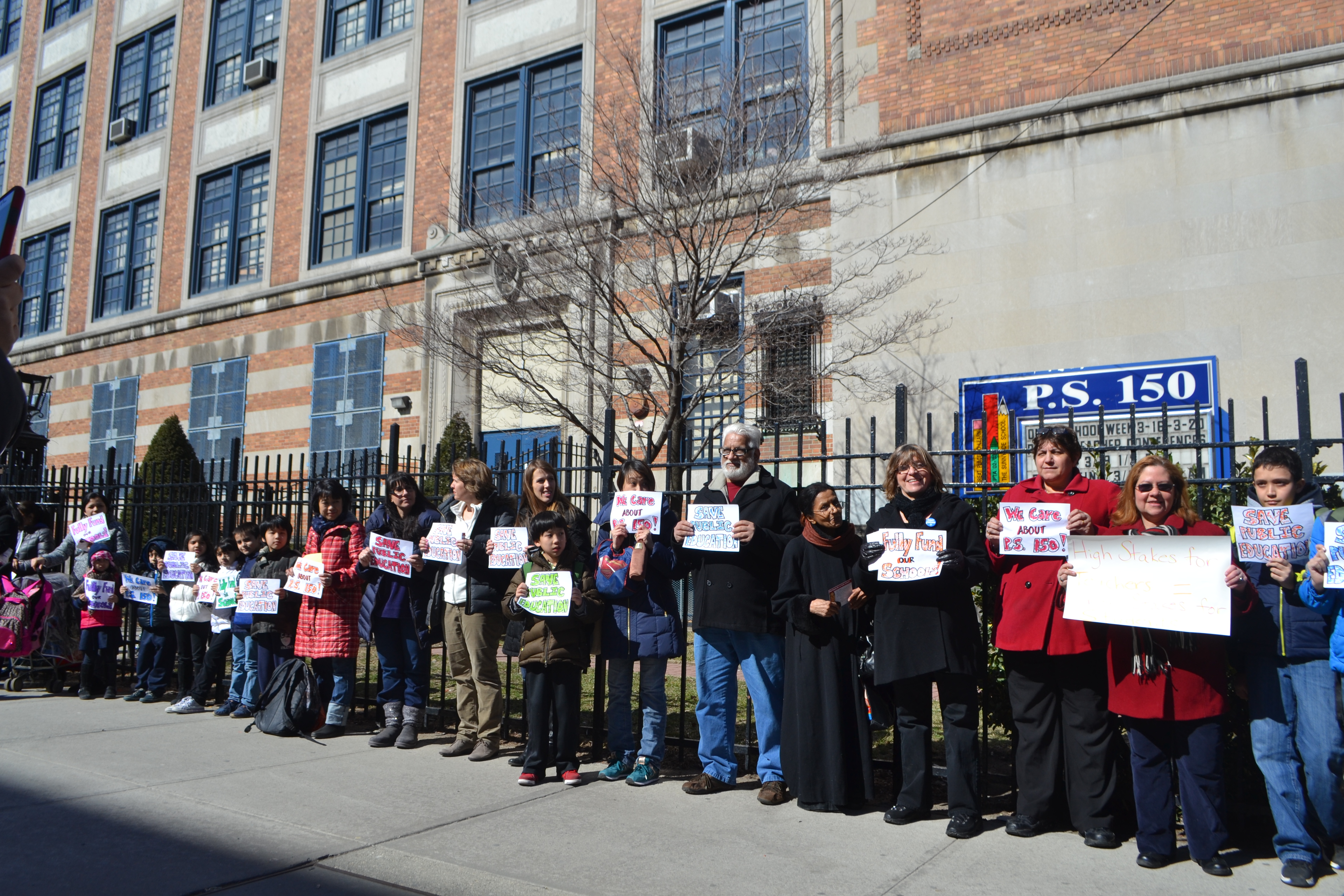 “We are proud of being a public school, we love our public schools and we are the parents and the teachers and the students that are affected by these proposals, so we are the ones that should be heard,” said Deborah Alexander, a parent of a student at P.S. 150 who helped organize the rally. “It’s all a political dance and we’re just the pawns, except the pawns are children. It’s very disconcerting.”
