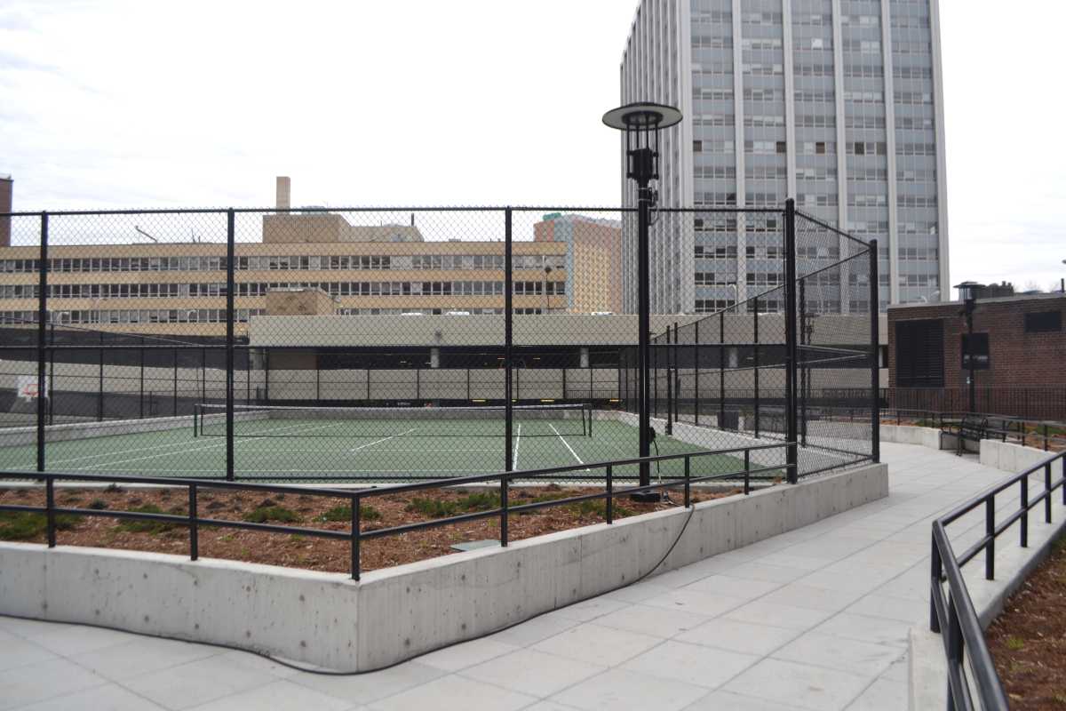 The courtyard, which is the first phase of projects aiming to transform the outdoor amenities at LeFrak City, features new trees and shrubs, walkways, a new seating area with benches and picnic tables, and two athletic courts currently used for basketball and tennis.