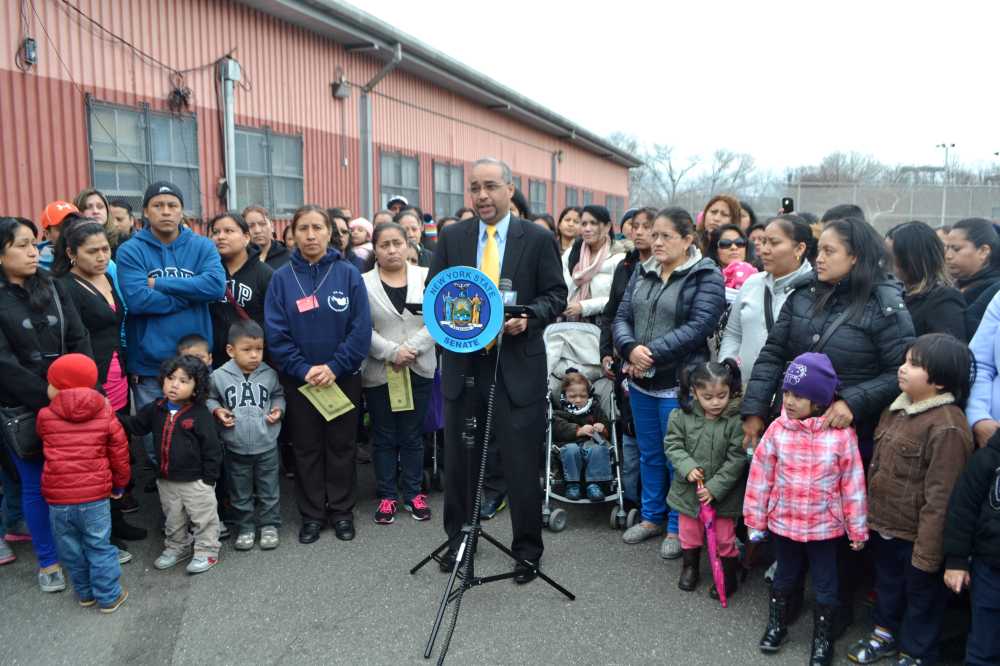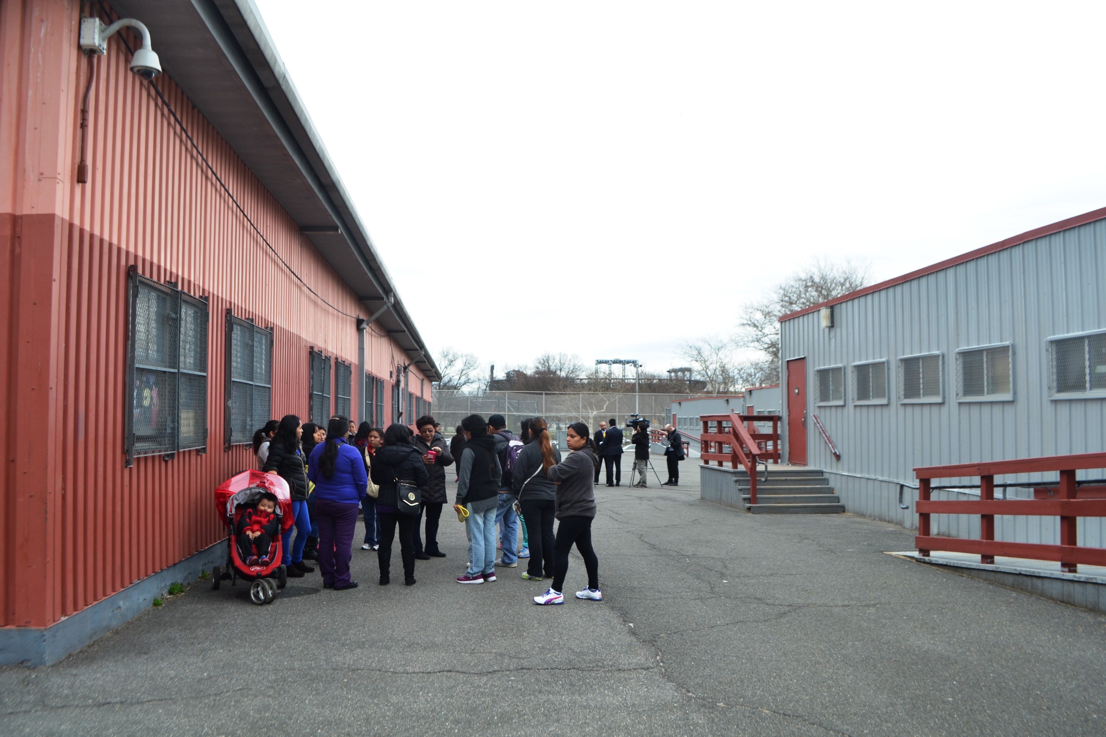 Over a hundred parents and children gathered on Tuesday morning with state Senator Jose Peralta outside of P.S. 143, The Louis Armstrong Elementary School, located at 34-74 113th St., to propose the building of a permanent addition to the school to help alleviate the chronic overcrowding.