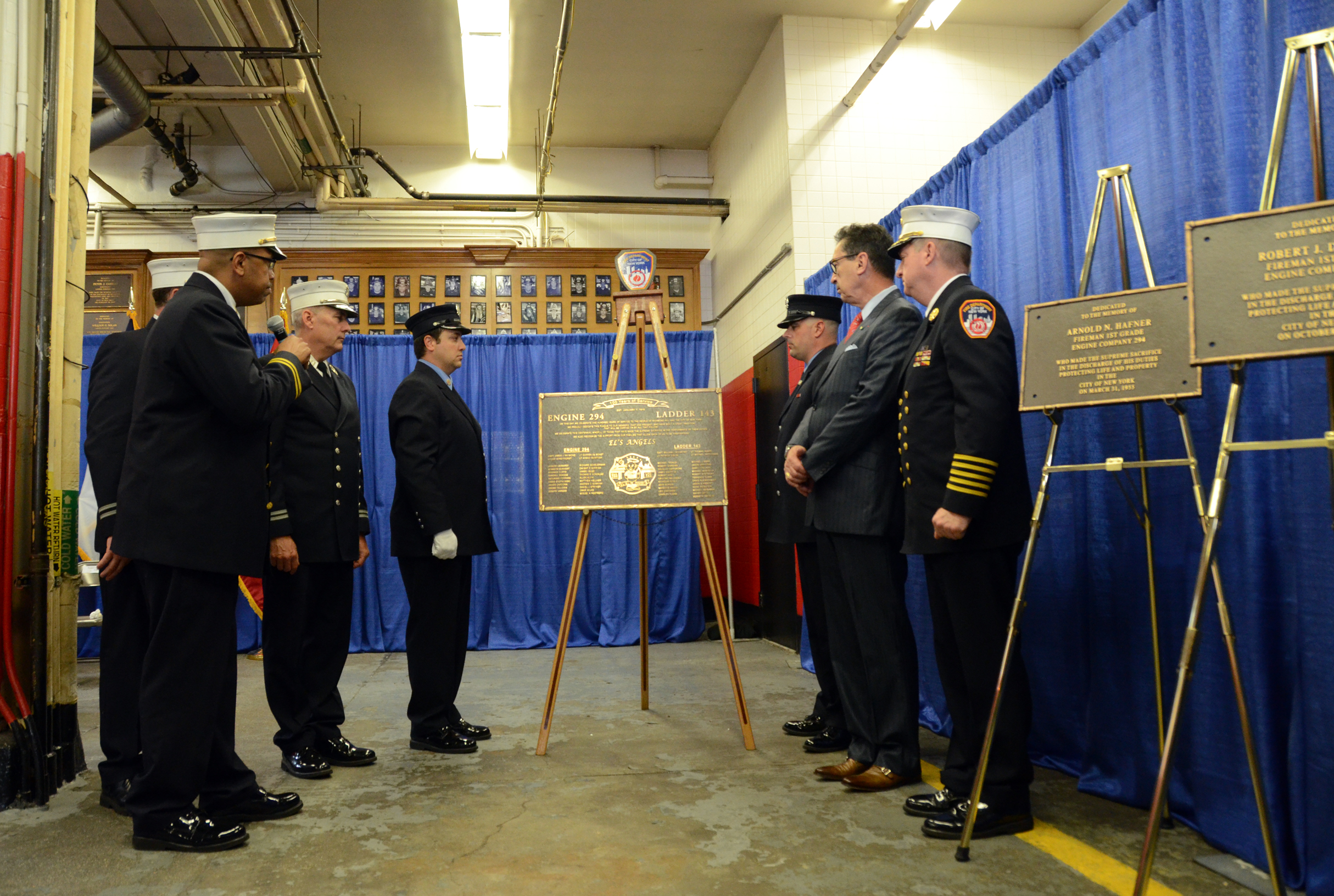 At the ceremony, two firefighters from Engine 249 who died in the line of duty were honored with a plaque. Members discovered that Firefighter Arnold Hafner, who died in 1955, and Robert Denney, who died in 1960, did not have their own plaques in the firehouse, but now their names will join three lieutenants who sacrificed their lives to help others.