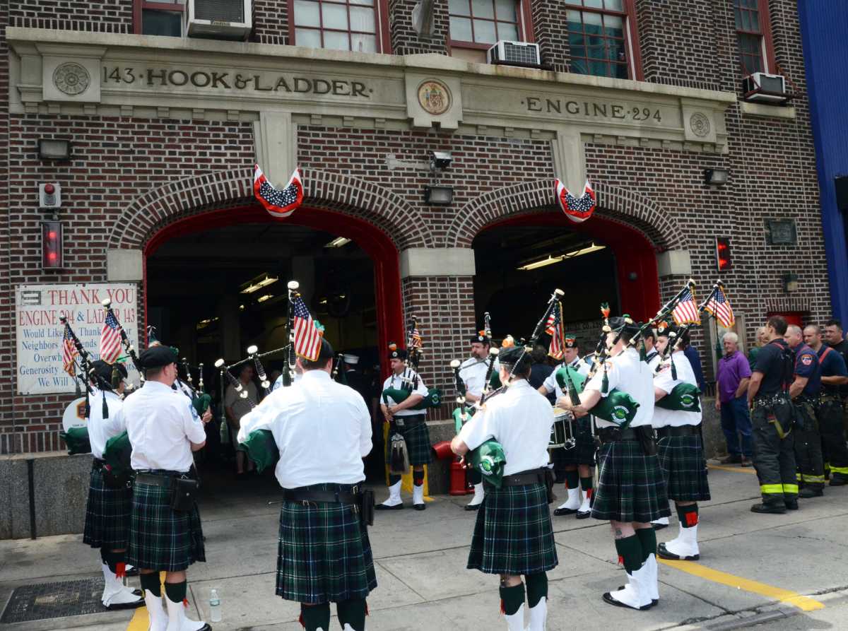 Captains James Raymond of Engine Company 294 and William McCarthy of Ladder Company 143 congratulated the current members for their service and their efforts to celebrate the history of the firehouse.