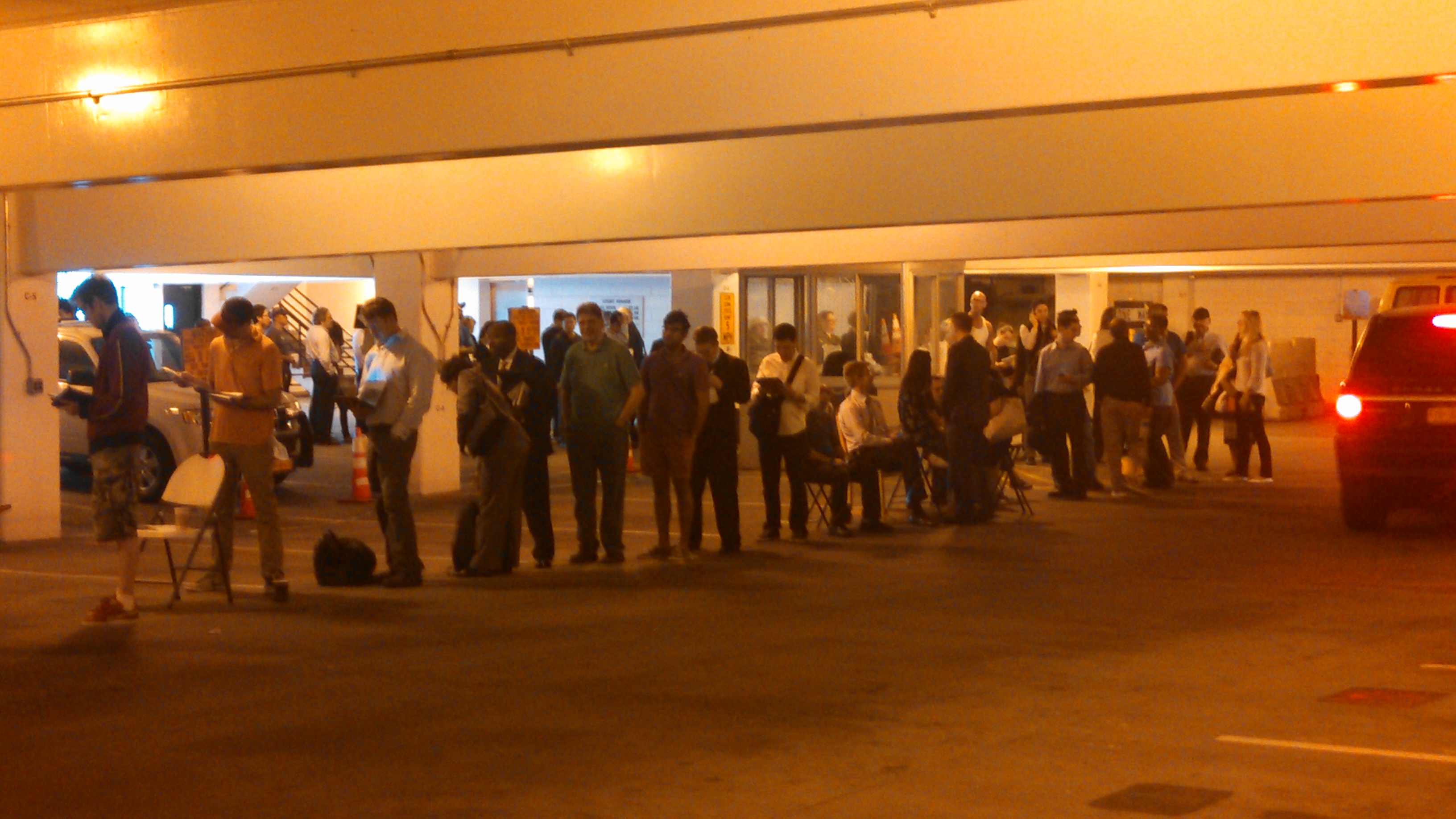 Lines of hundreds of people fill the parking garage during those days and people have to wait in the middle of active driveways, some bringing in chairs to wait, according to residents. They say parking spaces have also been taken away to make room for a DOT storage facility surrounded by a fence.
