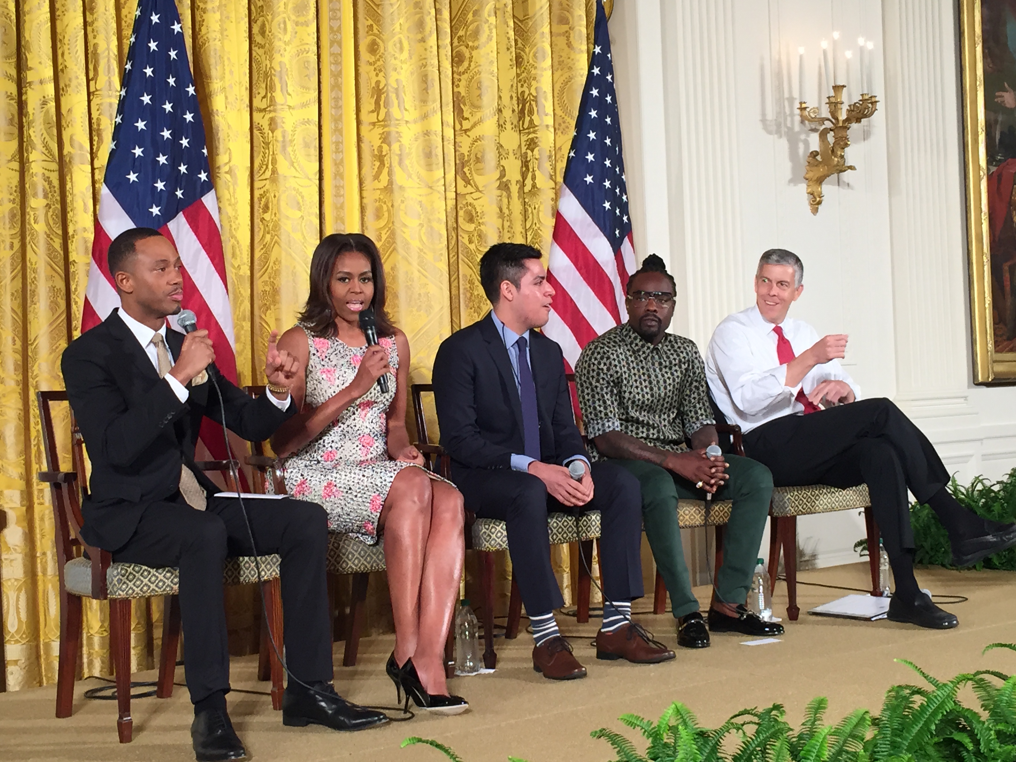 During the event, the students were able to listen to a panel moderated by E! News host Terrence Jenkins and featuring the first lady, U.S. Secretary of Education Arne Duncan, musician Wale, and Manuel Contreras, a senior at Brown University and founder of the Inter-Ivy, First-Generation College Student Network (1vyG).
