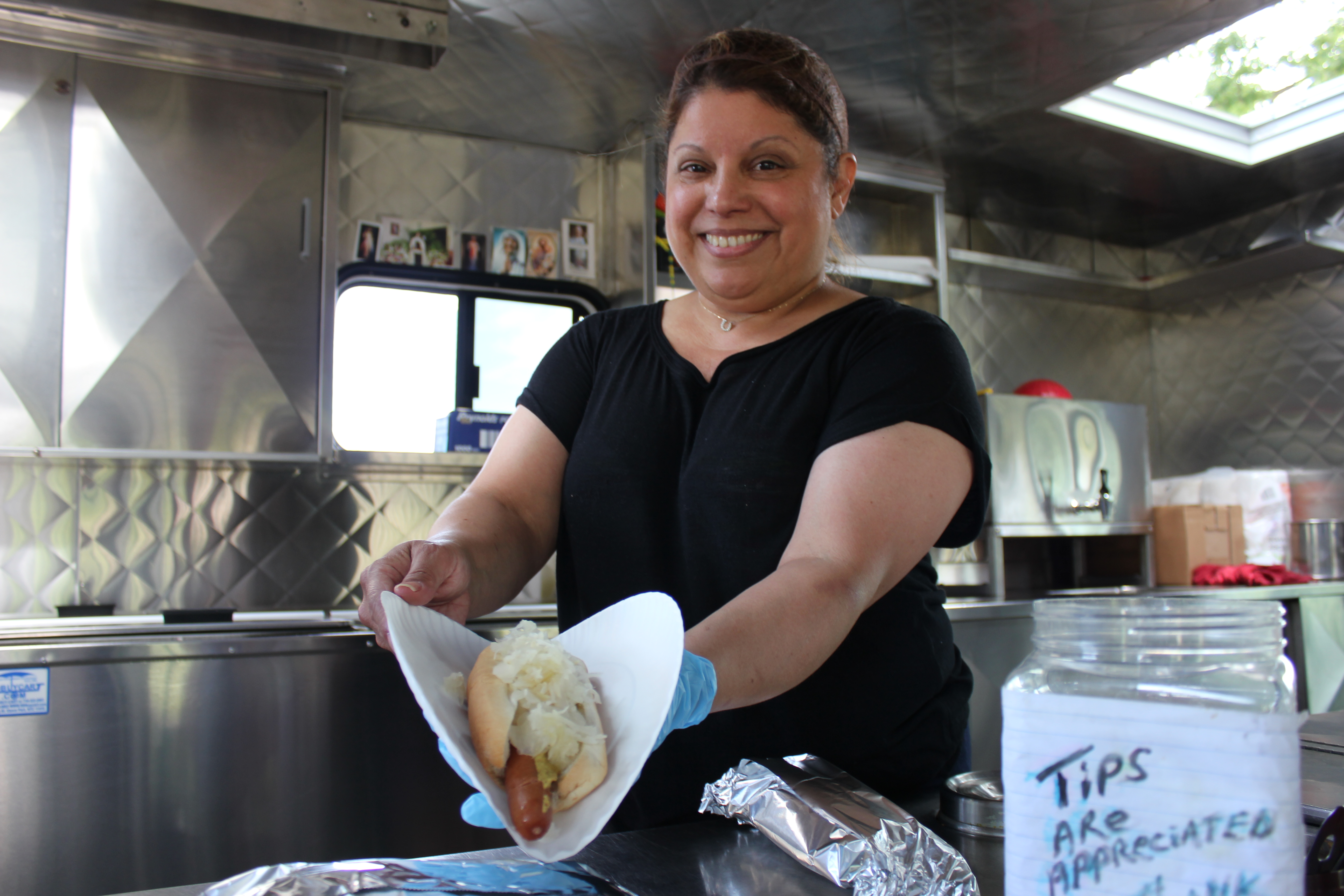 Head back to Rego Park and make a pit stop at Dominick’s. This bright blue truck has long been a local favorite, serving up classic steamed Sabrett hot dogs topped with their homemade sautéed onions or sauerkraut ($3) and chili cheese dogs ($3.25).