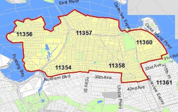 Parts of Auburndale, Bayside, Bay Terrace, Beechhurst, College Point, Flushing, Linden Hill, Malba, Murray Hill and Whitestone (bordered by Cross Island Parkway, Clearview Expressway and the East River to the north; Flushing Bay to the west; Northern Boulevard, 153rd Street, 35th Avenue, Utopia Parkway, 42nd Avenue, Clearview Expressway, 33rd Avenue, 215th Place and 31st Road to the south; and Cross Island Parkway to the east).