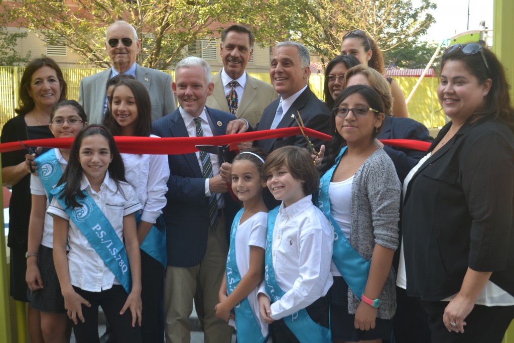 Students, faculty and elected officials gathered in front of the early childhood center at P.S./I.S. 78 in Long Island City on Friday to celebrate the opening of a new playground for pre-K, kindergarten and first grade students.
