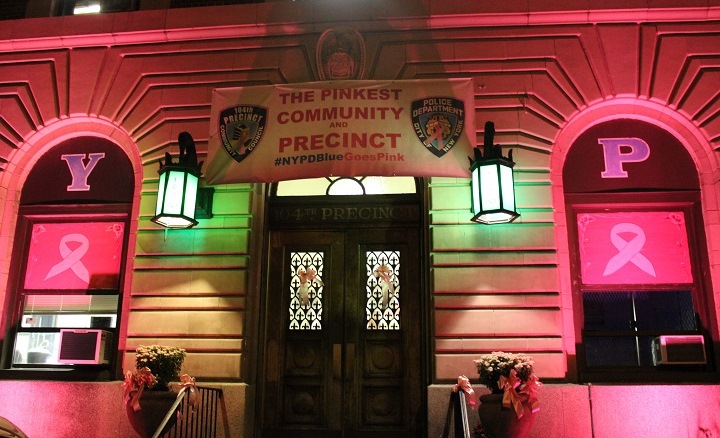 The color pink is currently on full display at the 104th Precinct on Catalpa Ave. in Ridgewood. A large banner donated by the 104th Precinct Community Council hangs above the precinct’s front door in an effort to draw attention to the cause. Officers also draped the precinct fence in a pink bunting and volunteered to paint the garage door with a giant pink ribbon.