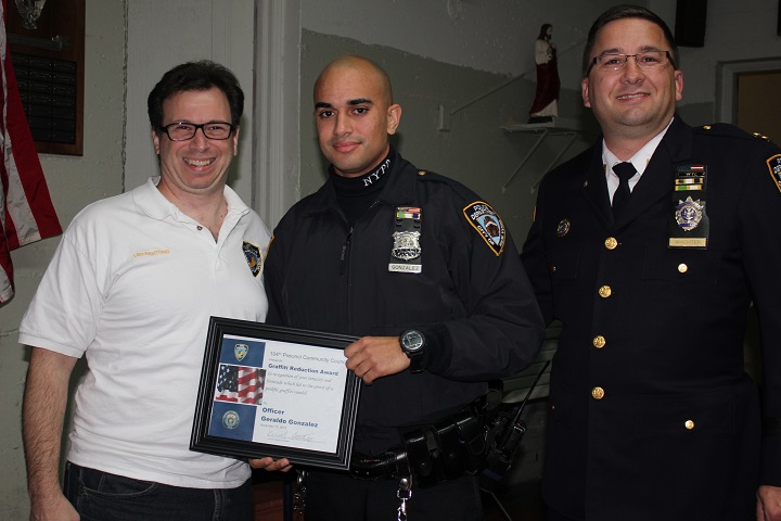 Precinct Council President Len Santoro also honored Officer Geraldo Gonzalez with the first-ever Graffiti Reduction Award for apprehending prolific vandals throughout the command.