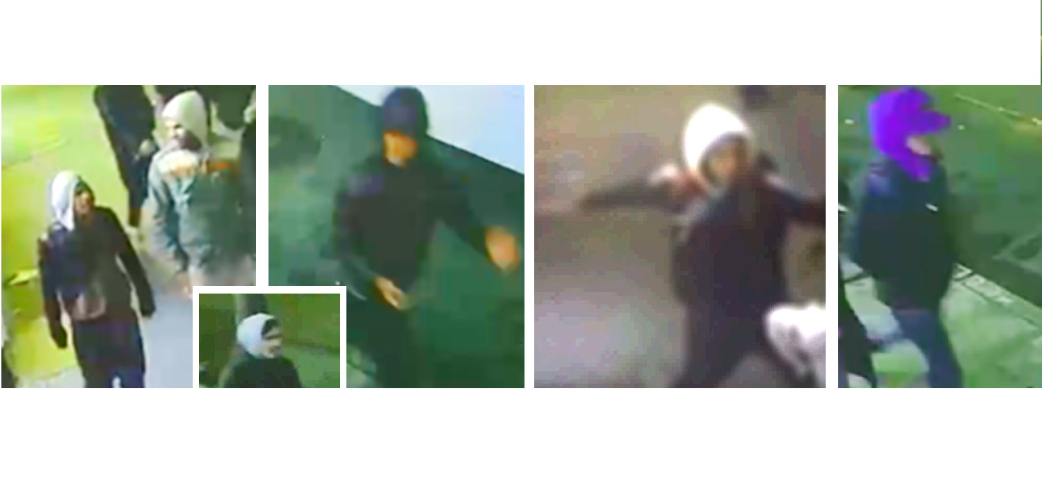 The third perpetrator was seen wearing a black hooded jacket, black pants and dark colored sneakers, while a fourth suspect was seen wearing a purple baseball cap and a purple hooded sweatshirt.