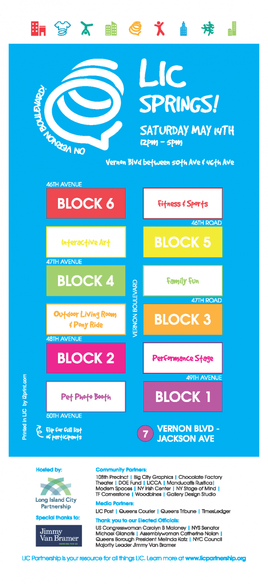 The third annual LIC Springs! will be hosted by the LIC Partnership and will shut down 50th Avenue through 46th Avenue to car traffic. From noon to 5 p.m., residents will be treated to performances by groups such as Jessica Lang Dance, Thalia Spanish Theatre, Sabor & the Afro-Latineers Band and more.
