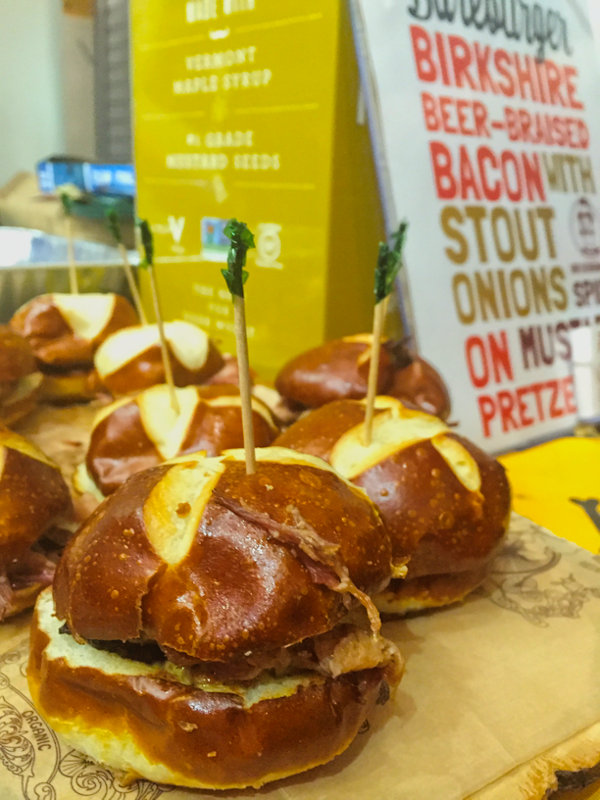 #2 Birkshire beer-braised bacon with stout onions on a mustard pretzel bun from Bareburger