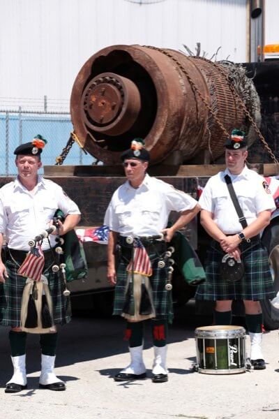 In a parking lot adjacent to the hangar, multiple speakers took the podium, their voices amplified above the sound of taxiing jets nearby. Behind the podium were two flatbed trucks holding the last artifacts. One truck held a 35,000-pound express elevator motor and a 40,000-pound column from the Twin Towers’ underground parking structure, while the other held a 40,000-pound piece of the North Tower’s massive television antenna.