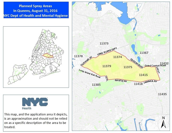 According to the Health Department, the areas set to be sprayed include: Briarwood, Elmhurst, Forest Hills, Forest Hills Gardens, Glendale, Jamaica, Jamaica Hills, Kew Gardens, Kew Gardens Hill, Maspeth, Middle Village, Rego Park, Richmond Hill, and Ridgewood.