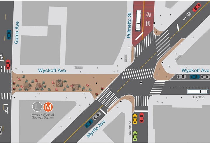 The Department of Transportation (DOT) announced that on Wednesday, Sept. 21, it would start to install the long-awaited pedestrian plaza project at the six-legged intersection at Myrtle Avenue, Wyckoff Avenue and Palmetto Street.