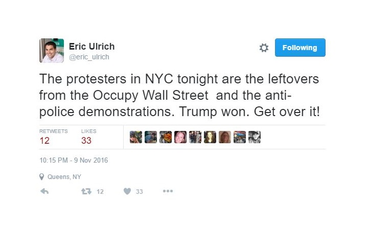“The protesters in NYC tonight are the leftovers from the Occupy Wall Street and the anti-police demonstrations. Trump won. Get over it!” Ulrich tweeted at 10:15 p.m. on Nov. 9.