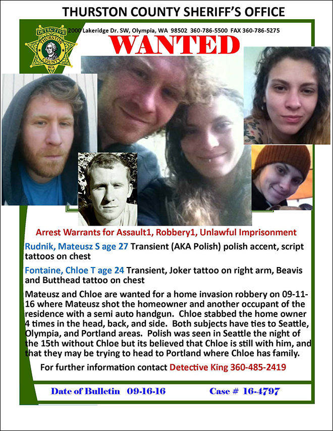 Both Fontaine and Rudnik were said to reside in Washington State and have ties to Seattle and Portland, OR. According to law enforcement sources, they fled the Pacific Northwest after they allegedly shot and stabbed two people while robbing a home in Thurston County, WA, on Sept. 11 of this year.