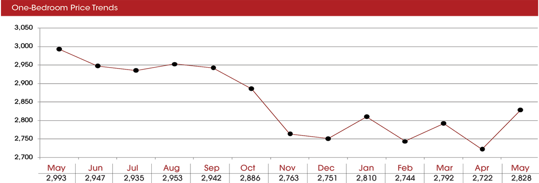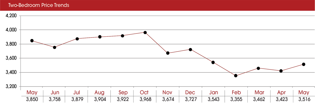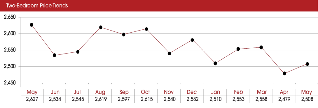 In May 2016, a two-bedroom apartment cost $2,627 but in May 2017, the average price was $2,508.