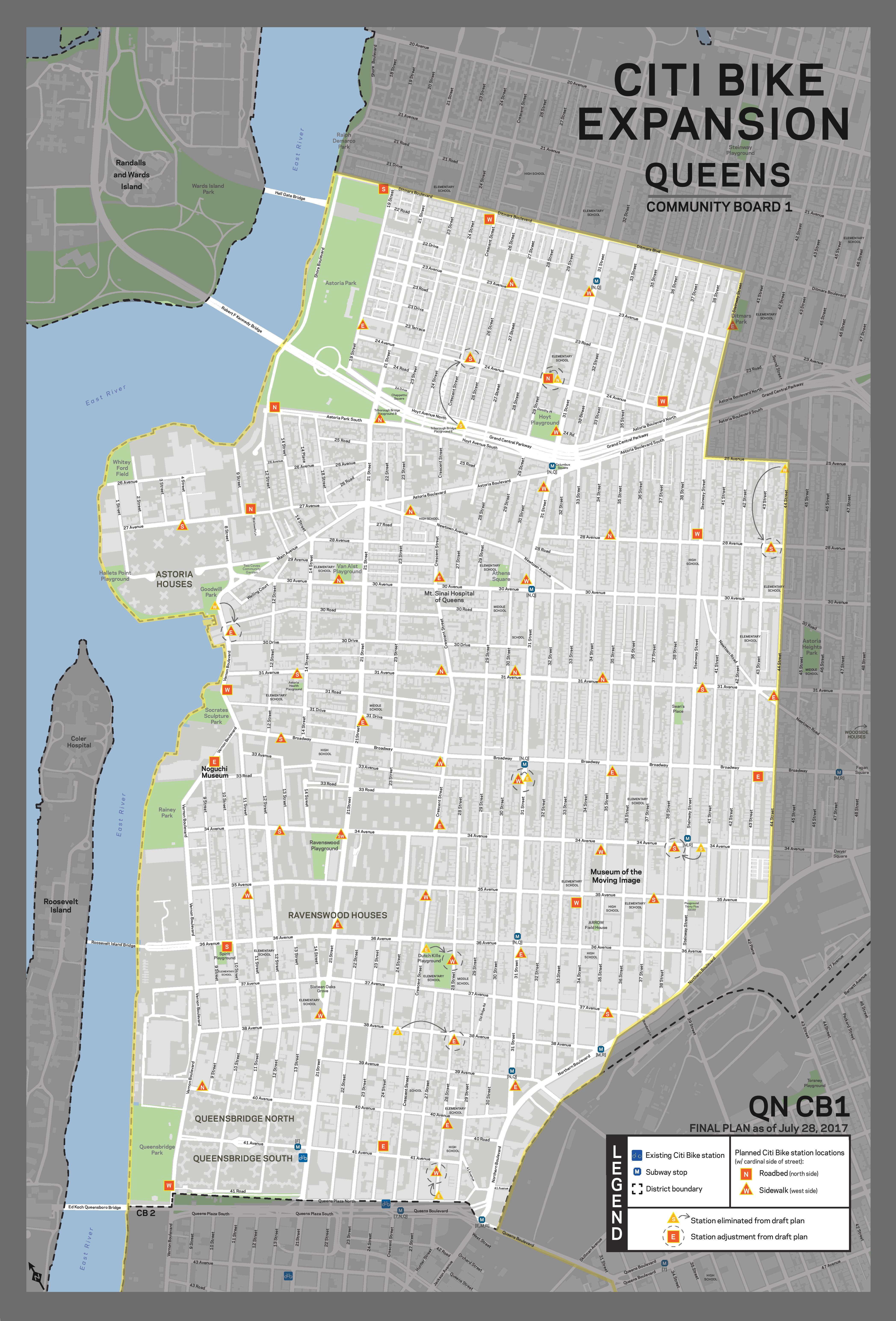 The final map for the addition of 59 Citi Bike stations in Astoria was released on July 28 and the stations will be up and running in the next few months.