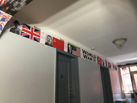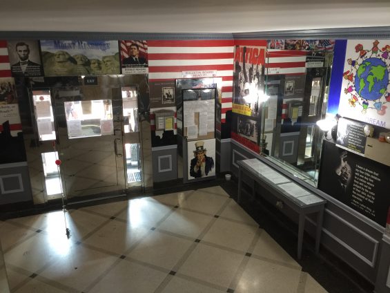 The lobby, which depicts prominent figures and moments in American history, like the raising of the flag at Iwo Jima, the founding fathers, and Dr. Martin Luther King Jr., also has imagery spilling over into the hallways on the first floor, where a World War II banner shows leaders of the Allied and Axis powers, including an image of Hitler and the Nazi flag. The lobby also includes a Civil War section showing Confederate and Union imagery, including Robert E. Lee and the Confederate flag.