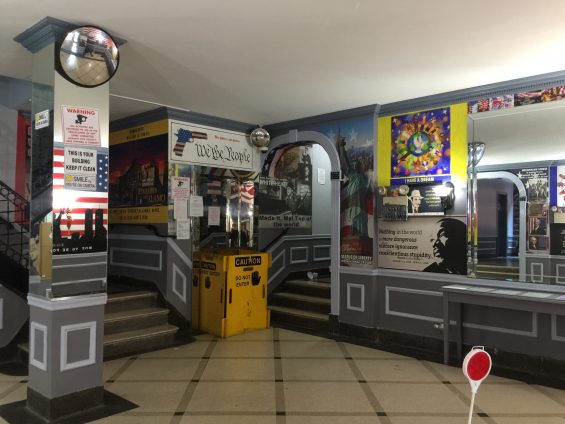 Inside the lobby are images of Hitler, Mussolini, a large swastika, and the Confederacy peppered among an elaborate display of American symbols and paraphernalia.