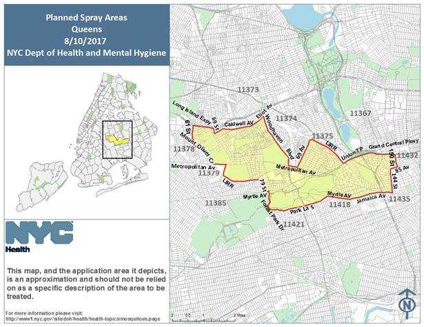 The spraying will take place from 9 p.m. on Thursday night, Aug. 10, and continue until 6 a.m. the following morning across areas of Briarwood, Forest Hills, Glendale, Jamaica, Kew Gardens, Maspeth, Middle Village, Richmond Hill, and Woodhaven. (In the event of inclement weather, spraying will be postponed until Monday, Aug. 14, during the same hours).
