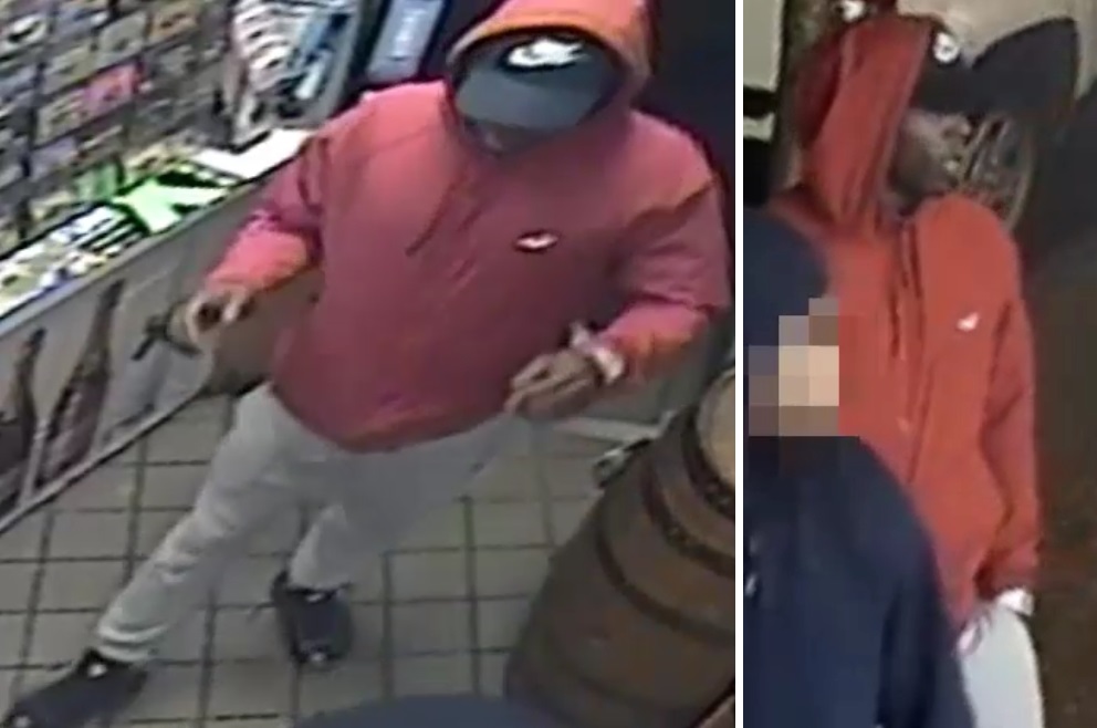 The suspect is described as a black male in his 30s. He was last seen wearing a black baseball cap, red hooded sweater, grey sweatpants and black sneakers.