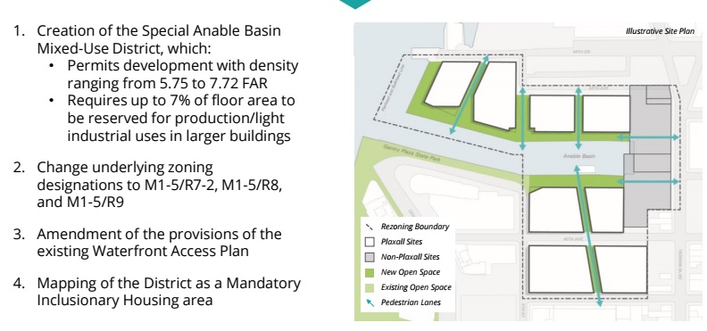 The plan would create a 14.7-acre Special Anable Basin Mixed-Use District spanning from 44th Drive and 45th Avenue to the north, Vernon Boulevard to the east, 46th Road to the south and the East River to the west. It will need to go through the Uniform Land Use Review Procedure and be approved by Community Board 2, Queens Borough President Melinda Katz, the City Planning Commission and City Council.
