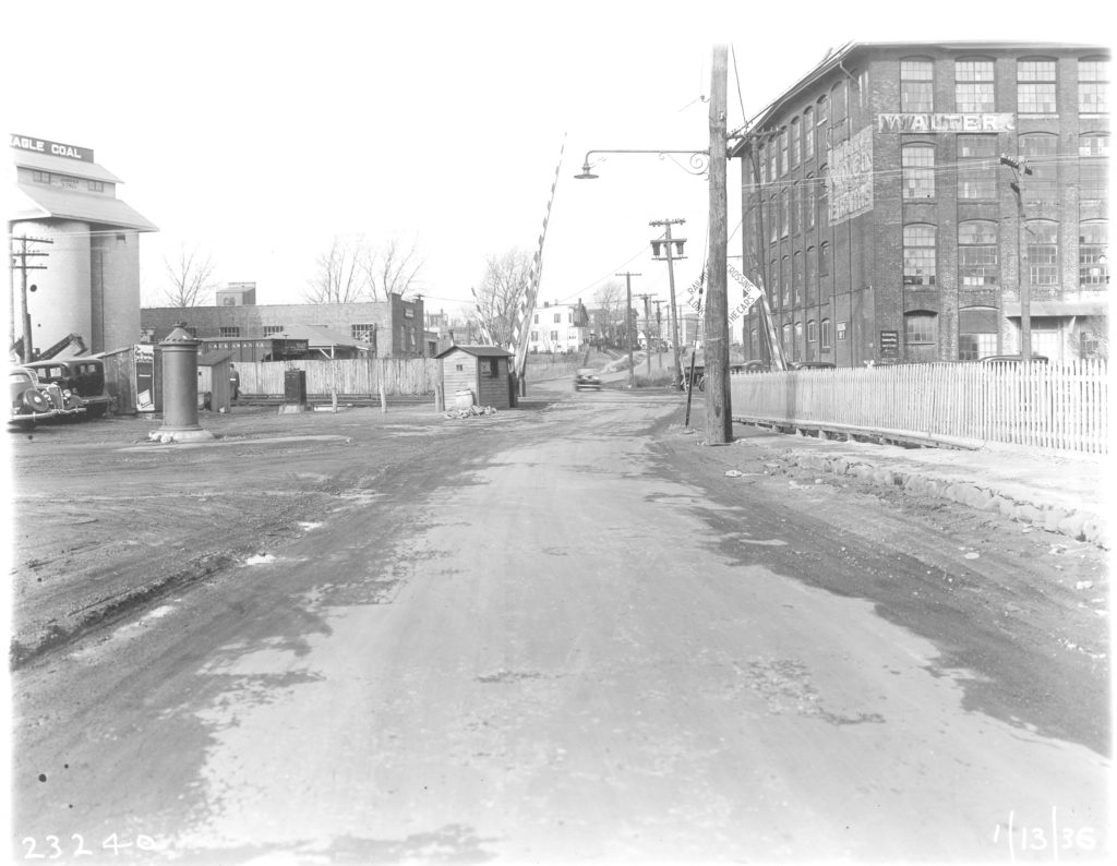 This 1936 photo provides a view looking north along Dry Harbor Road (80th Street) in Glendale from about 200 feet south of the Long Island Rail Road tracks. At right is the Atlas Terminal Building No. 1, while at left, the Eagle Coal Co. is partially visible.