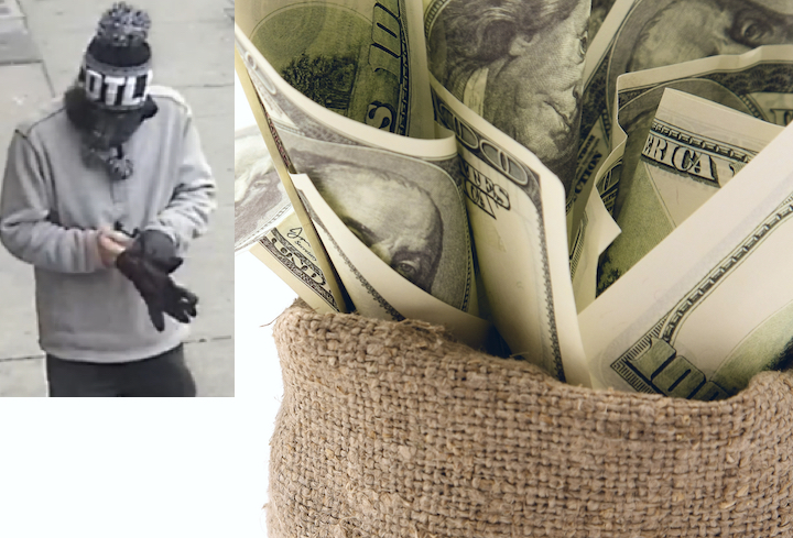 Police described the bandit as a white man standing 5 foot 9 inches tall and weighing 180 pounds who was last seen wearing a winter hat, a gray scarf, gray fleece sweatshirt, dark pants, gray sneakers and black gloves.