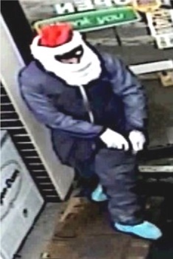 Law enforcement sources said the phony Santa walked into the gas station shop, displayed a handgun and ordered a 26-year-old male clerk to enter the bathroom and lie on the floor.