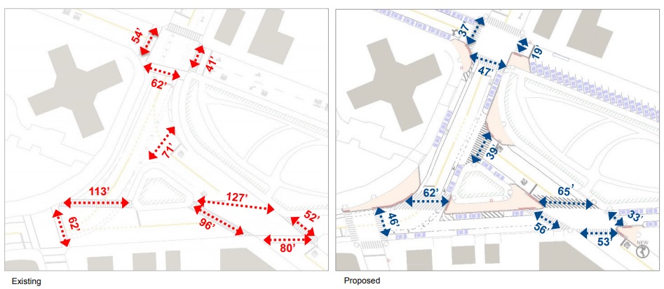 According to Wagner, the crossing distances are also longer than average crossings in the city. A pedestrian crossing from Eighth Street to the triangle on Main Street must travel 113 feet. The average crossing distance is 30 feet.